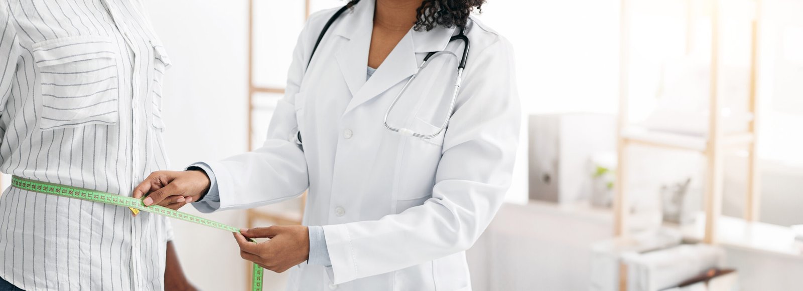 Close-up of doctor measuring waist of overweight man during his visit to the hospital